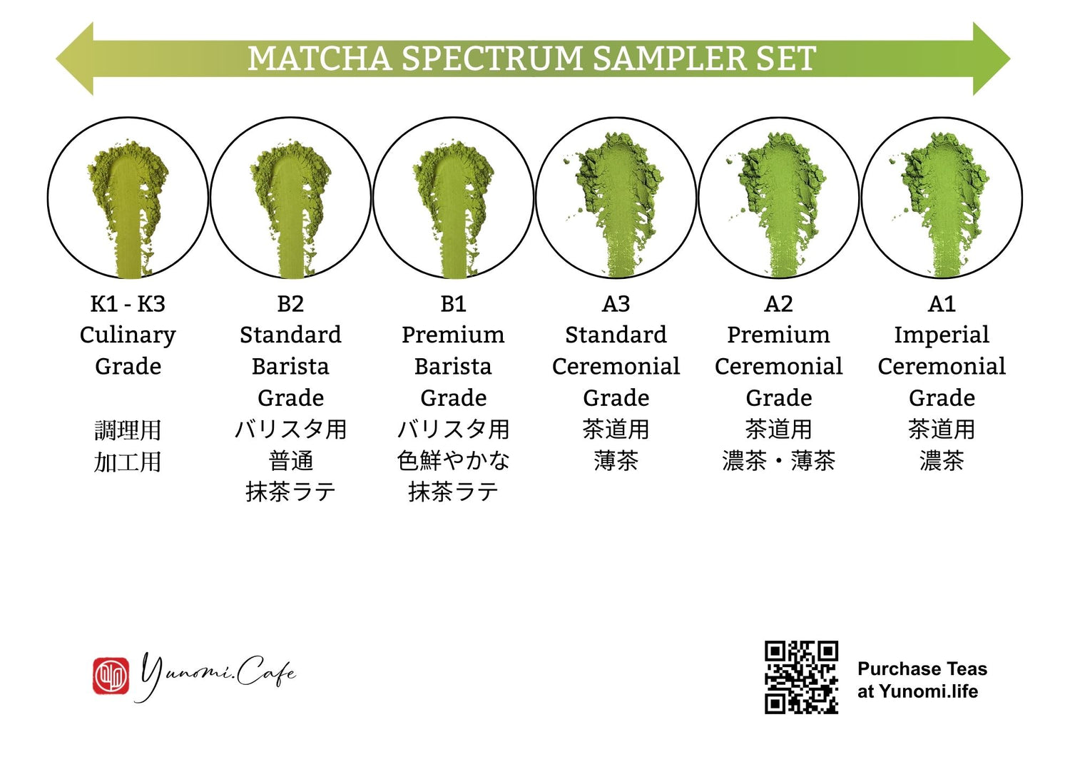 This sampler set features a spectrum of six 10 gram samples of matcha at various grade levels based on our system of matcha grading, highlighting the differences in flavor from the lowest culinary grade with the highest amount of bitter-tasting antioxidants to most delicious, umami-rich (theanine-rich) imperial ceremonial grade.